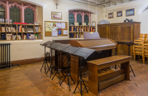 The choir vestry houses an upright piano and an electronic classical organ, both available for practising, and the church has two grand pianos, another electronic classical organ and a fine three-manual 1966 Walker pipe organ.